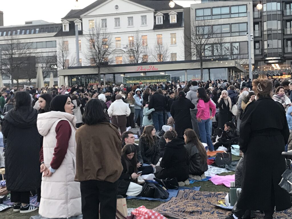 Kassel. Mittwoch, 18. März. Gegen 18 Uhr erreiche ich den Friedrichsplatz. Das erste, was ich sehe, sind Hunderte von Menschen und eine riesige Schlange vor einer Essensausgabe. Bis zum Sonnenuntergang sind es noch etwa 30 Minuten. Dann findet hier das größte gemeinsame Fastenbrechen Deutschlands statt. Die Idee und Initiative ist von einem 23-jährigen Kassler: Sidney Burnie. Wenige Wochen zuvor kam ihm diese Idee eines gemeinsamen Fastenbrechens. Sein Ziel: Menschen zusammenzubringen. Das ist ihm gelungen. Etwa 3.000 muslimische wie nicht muslimische Menschen vieler Kulturen versammeln sich auf Picknickdecken und warten plaudernd, bis die Sonne untergeht. Nach einem kurzen Gebet wird das Fasten mit Datteln gebrochen.