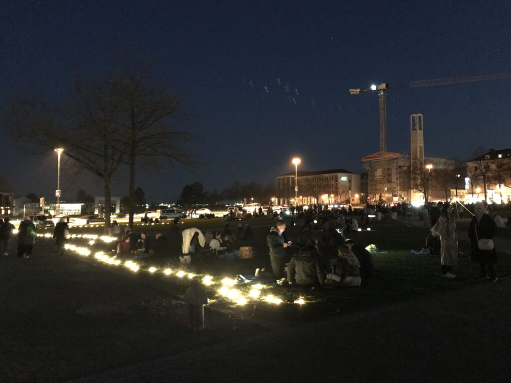 Neben uns sitzen drei muslimische Personen aus einem Vorort von Kassel. Aus der Gruppe hatten sich zwei Menschen an der Essensausgabe angestellt, weshalb sie nun zu viel Essen haben, das sie gerne mit uns teilen. Wir teilen Süßigkeiten mit ihnen. Die Mutter der Familie auf der anderen Seite unserer Picknickdecke steht mit ihrer älteren Tochter noch an einer der über 100 m langen Schlangen vor der Essensausgabe an, so dass sie nicht rechtzeitig zum Fastenbrechen zurück ist. Der Vater ist dankbar, dass wir nun wiederum mit ihnen teilen können und seine jüngere Tochter etwas zu essen bekommt. Dafür bietet er uns Tee an. Wir kommen ungezwungen ins Gespräch mit Menschen, die wir sonst nie getroffen hätten.