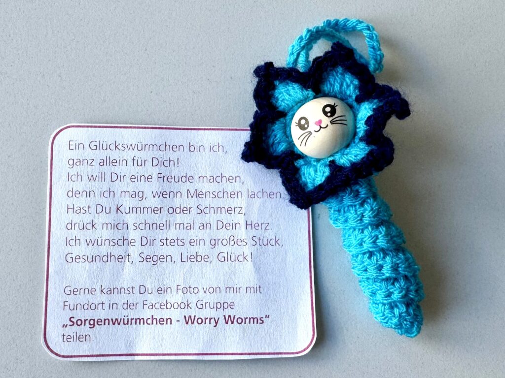 Einmal hatte ich ein schönes Erlebnis: meine Kollegin zeigt mir freudestrahlend ein Glückswürmchen. Siehe Foto. Es sind kleine künstlerisch gestaltete Objekte, und offensichtlich liebevoll hergestellt. Ein Zettel lag auch dabei, um den Zweck zu erklären.