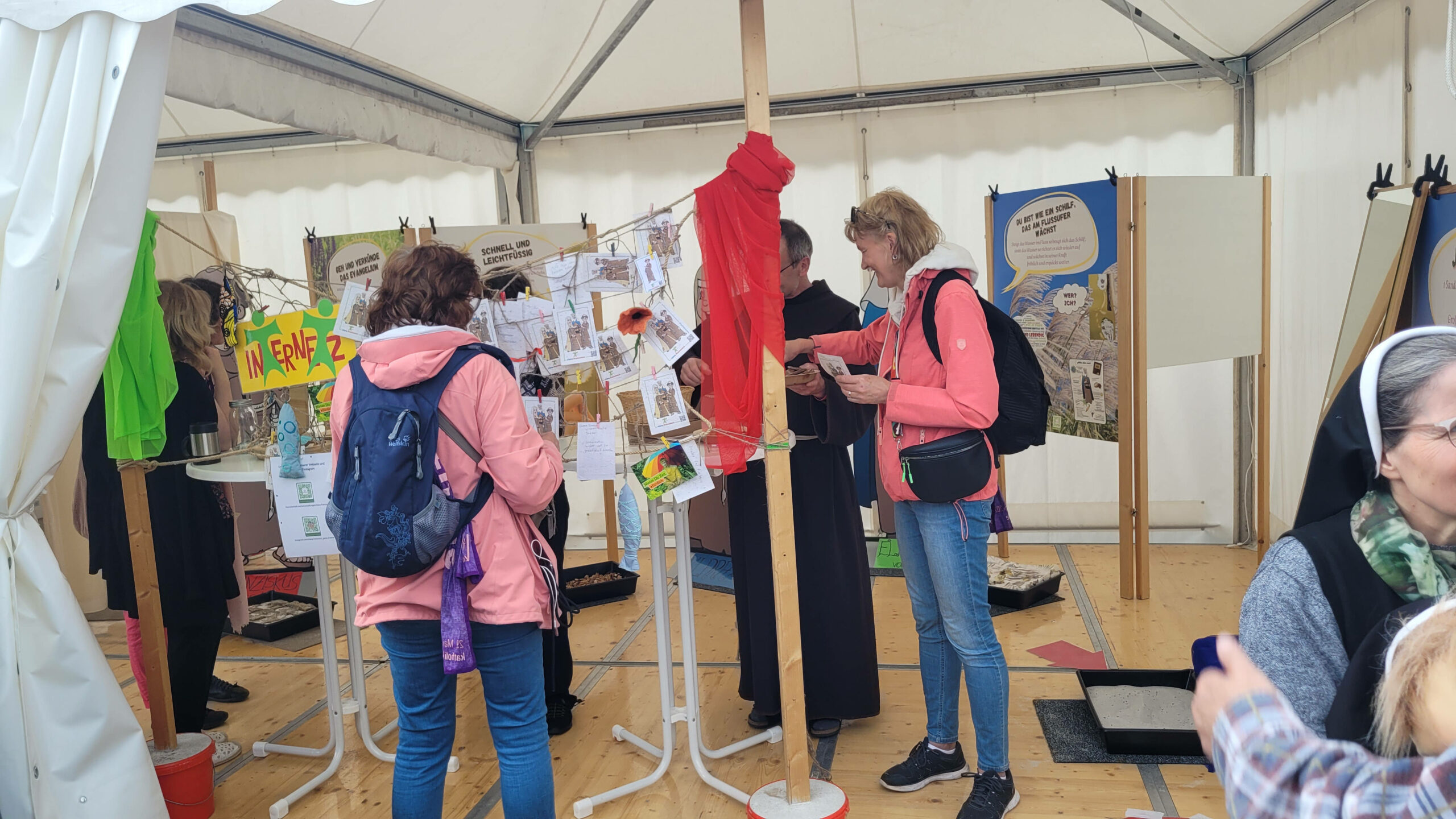 Begegnung ermöglichte Br. Gabriel mit seiner Kirche unterwegs, Sr. Gertrud mit den Handpuppen Franziskus, Klara und Elisabeth und natürlich unser Stand auf der Kirchenmeile mit einem Barfußpfad und „Internetz“. Hier waren viele Schwestern und Brüder der ganzen franziskanischen Familie beteiligt – Begegnung nicht nur mit den Besuchern, sondern auch untereinander. Sofort ins Gespräch kamen die Menschen beim Tau-Schnitzen. Auch das Reichen eines Wasserbechers ist immer ein guter Einstieg. Mit den handbeschriebenen Segenskarten waren auch die Schwestern am Katholikentag beteiligen, die selbst nicht Vorort sein konnten. Einen Segen zugesprochen bekommen, berührt Menschen immer sehr.